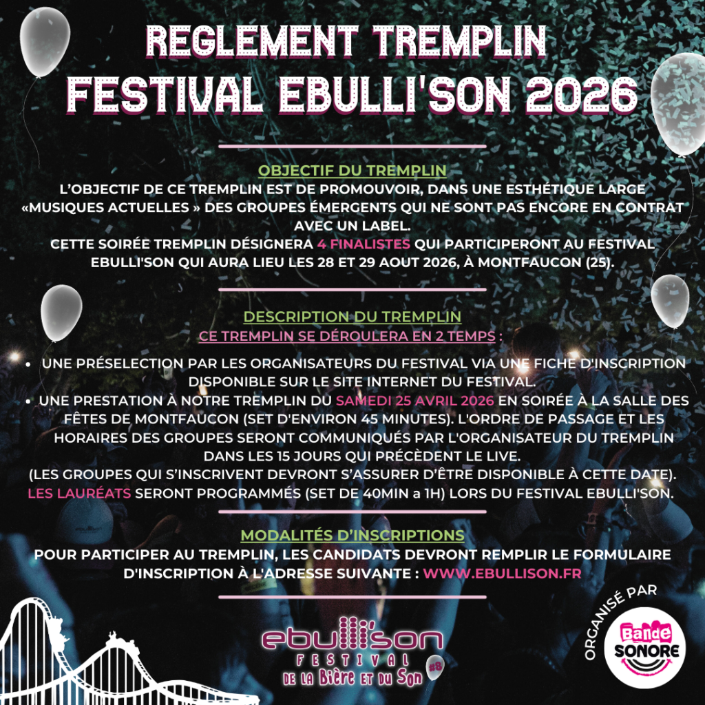Vous êtes artistes ou groupes et vous souhaitez tenter votre chance pour participer à notre 8ème édition ? Inscrivez vous à notre tremplin qui se déroulera le 25 avril prochain à Montfaucon (25)