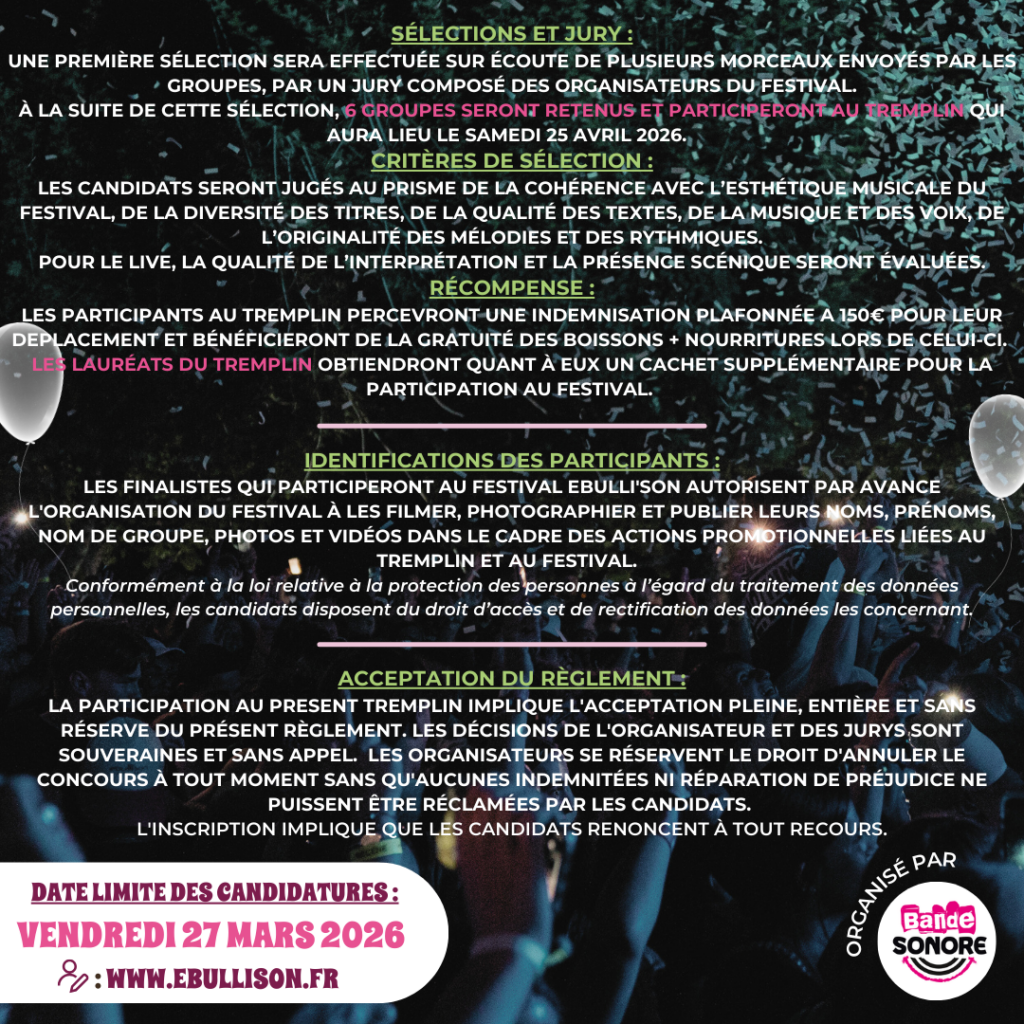 (6 groupes seront sélectionnés pour participer au tremplin, et 4 d’entre eux accéderont au festival après dépouillement des votes)